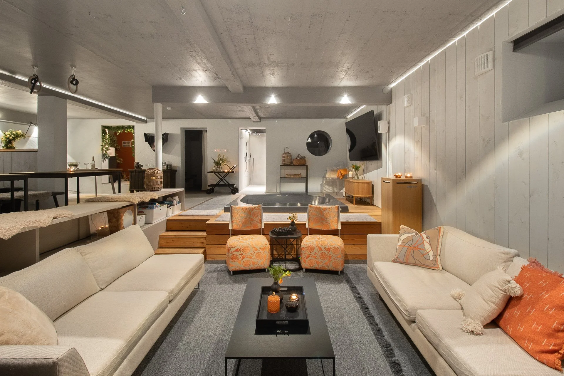 Tilasta löytyy avoimen tilan lisäksi ruokailu- ja oleskelutila sekä spa-osasto, joka sisältää tilavan saunan lisäksi myös tyylikkään Drop porealtaan.
